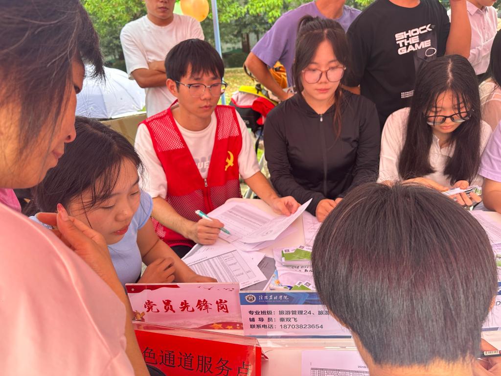 在迎新现场,身着统一红色马甲的党员志愿者们格外显眼,他们忙碌的身影穿梭于人群中,或是在校门口迎接新生,或是帮助新生搬运行李,或是耐心解答新生的各种疑问。不仅如此,党员先锋岗还设立了咨询服务台,提供校园导览、入学须知等资料,确保每一位新生都能快速融入大学生活。