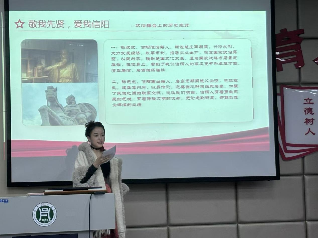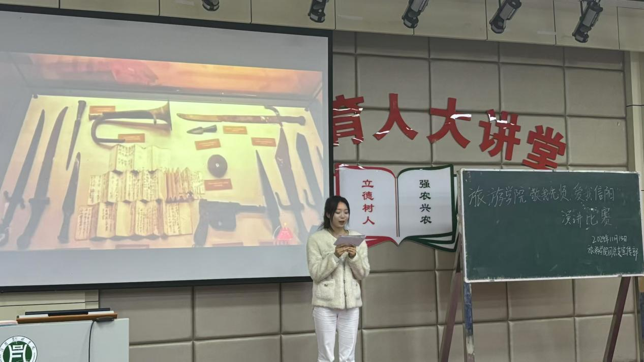 为深入学习贯彻习近平文化思想,贯彻落实习近平总书记关于加强文化遗产保护传承的重要论述和重要指示精神,按照《beat365在线平台官网“传承优秀文化 守护美好记忆”系列主题宣传活动实施方案》要求,11月15日中午,旅游学院在一教E101开展了“敬我先贤,爱我信阳”主题演讲比赛初赛。