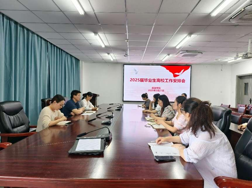 为扎实做好毕业生离校工作,营造安全、有序、温情的离校氛围,5月21日,旅游学院在双创楼310会议室召开2025届毕业生离校工作安排会,院党委书记朱长明出席会议并讲话,团委书记王芳及毕业班全体辅导员参加了会议,会议由党委副书记池水婧主持。