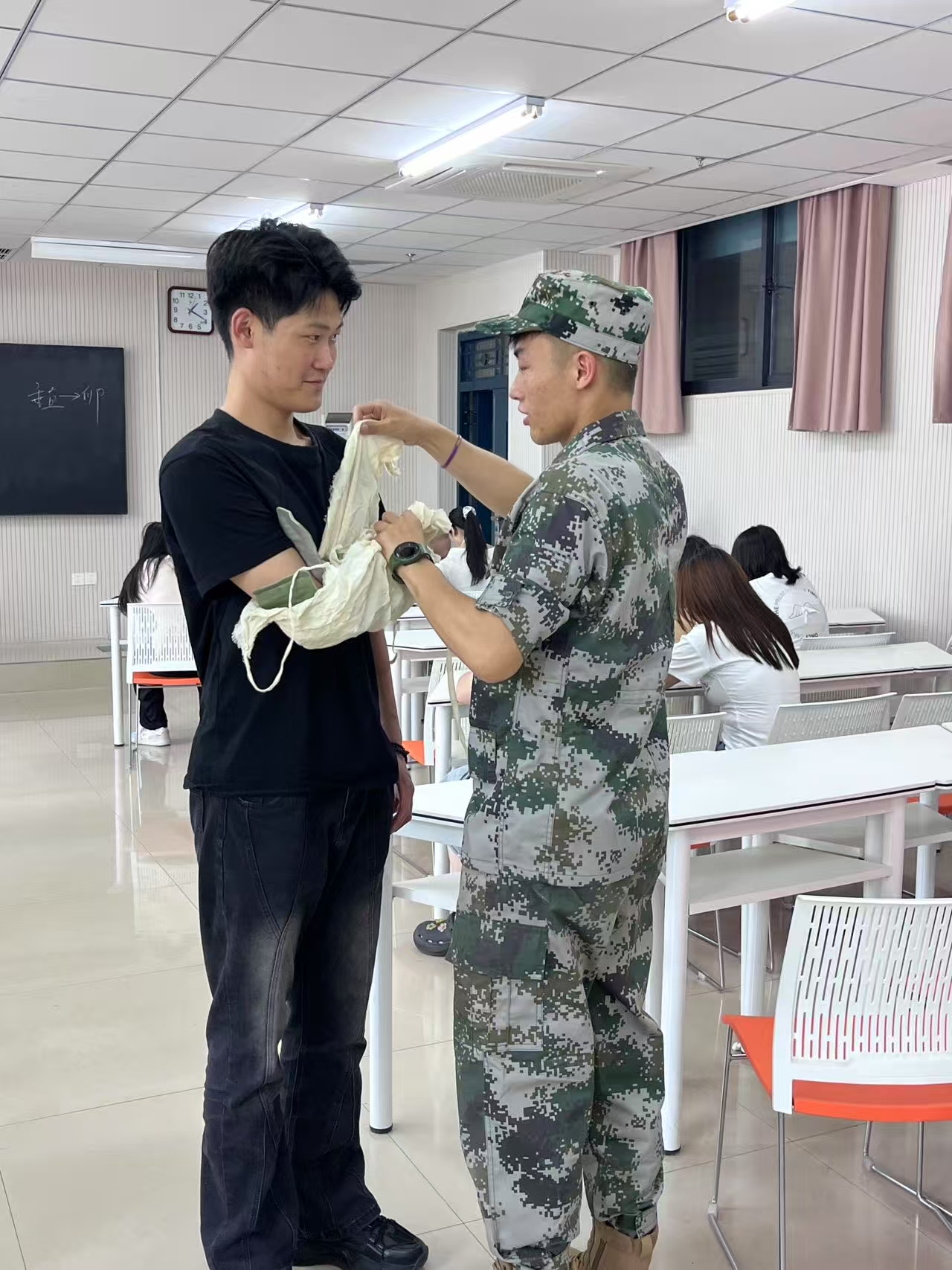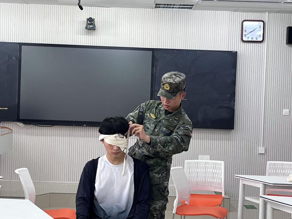 培训一开始,退役士兵们便迅速进入角色,为同学们模拟了一个真实的急救场景。他们首先教授了如何评估现场情况,确保环境安全,并做好个人防护。随后,详细讲解了呼救、拨打120急救电话以及判断患者呼吸状况等关键步骤,并告诉了同学们如何使用医疗包等急救用具,详细介绍了医疗包内的各种物品及其用途,还让同学们亲自动手操作,感受急救用具的实用性和重要性。他们耐心地为同学们提供指导,确保大家都能掌握正确的急救技巧。