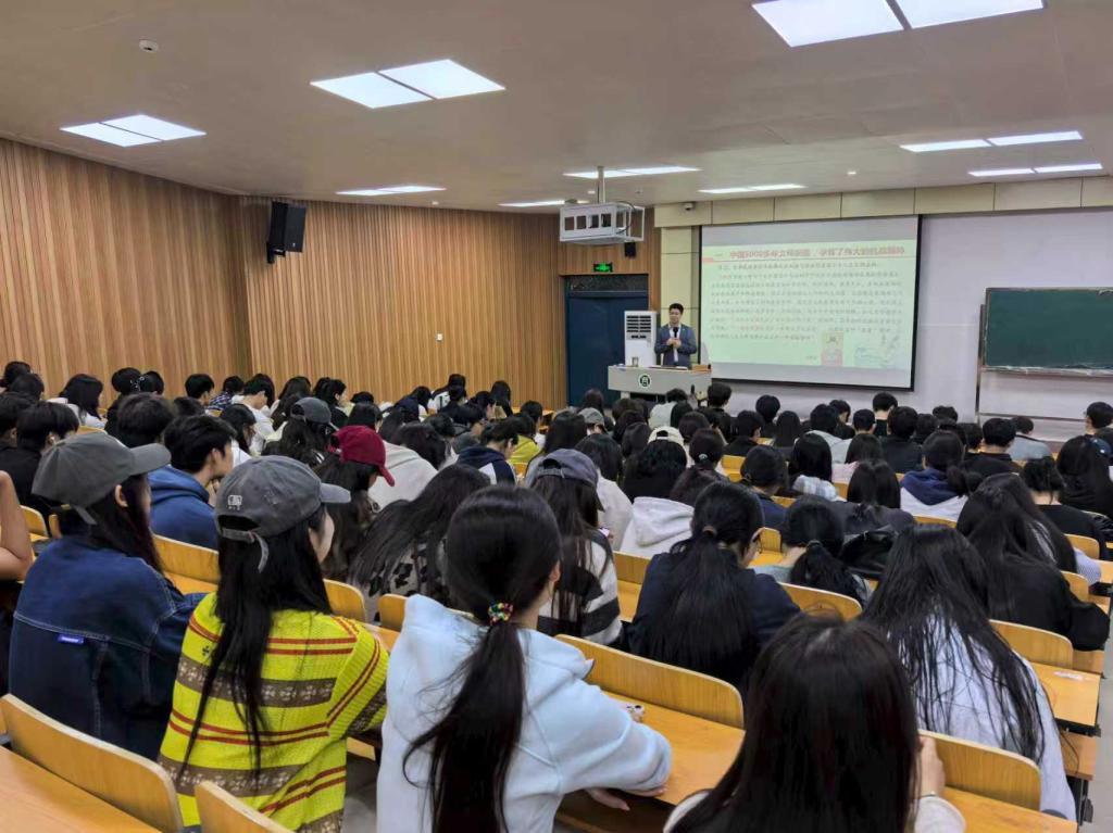 讲座立足中华民族伟大复兴的战略全局,系统阐述了伟大抗战精神的深厚内涵与时代价值。朱长明从“中国五千多年文明底蕴孕育了伟大抗战精神”讲起,深刻揭示了民族精神的历史连续性;通过回顾“波澜壮阔的抗日战争实践,铸造了伟大抗战精神”,生动展现了历史英雄在艰苦卓绝斗争中的民族气节;进而阐述了“投身世界反法西斯战争行列凝聚了伟大抗战精神”,彰显了中国共产党人的天下情怀与历史担当;最后聚焦“民族复兴的壮丽事业召唤和传承伟大抗战精神”,向全体新生发出了时代的召唤。