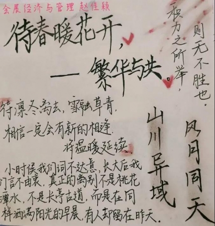 旅游管理学院于2020年5月9日-12日举办了“聚力同心,战疫同行”系列活动之“卡片抒心意”活动,号召同学们用制作卡片的形式向人们、向社会传递情感,释放心情。同学们积极参与,纷纷通过精心制作的卡片来表达自己对此次疫情期间各国突破国界、互相支持情谊的大力赞赏,表达对医护人员舍身忘我、无私奉献精神的崇高敬意,以及分享特殊时期上网课过程中如何提高自律的方法等,小小卡片,传递内心的声音,帮助同学们释放压力,放空心灵。