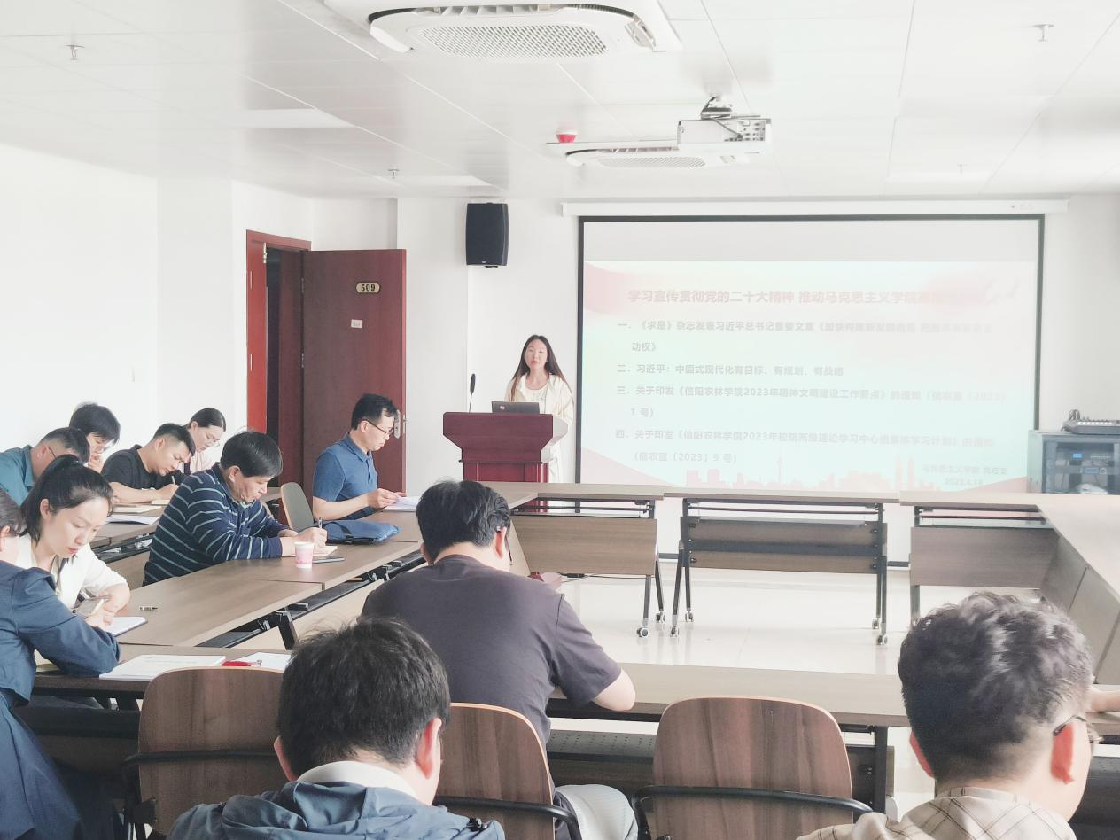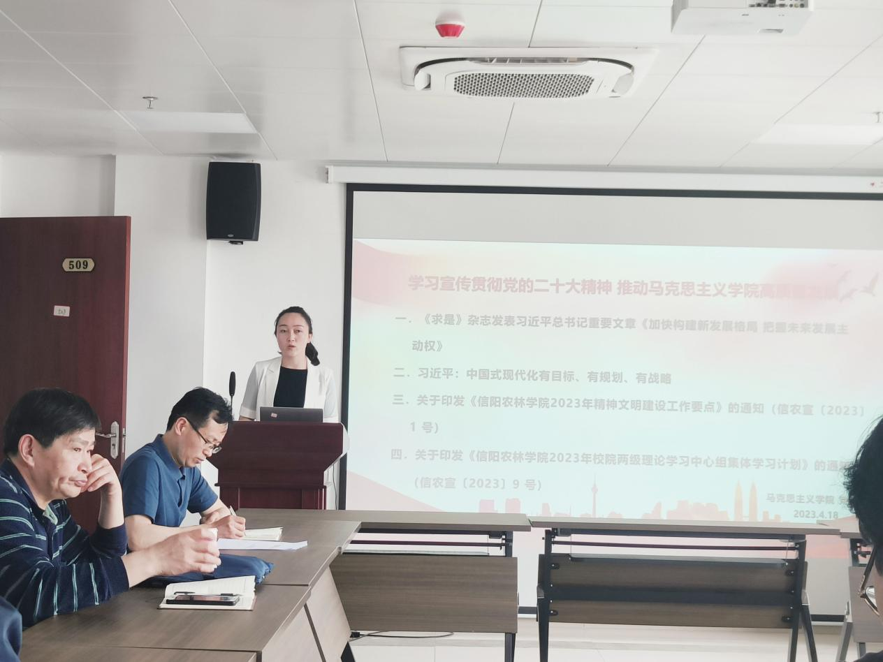 2023年4月18日下午,马克思主义学院在学术交流中心509会议室召开“学习宣传贯彻党的二十大精神,推动马克思主义学院高质量发展”工作会。会议由毛泽东思想和中国特色社会主义理论体系概论教研室主办, 周萃文主持,全体教师参加会议。
