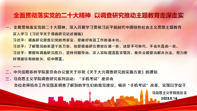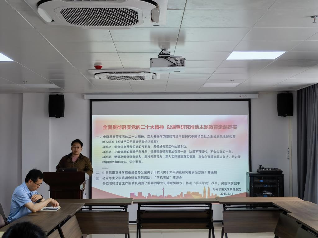 2023年5月16日下午,马克思主义学院在学术交流中心509会议室召开“全面贯彻落实党的二十大精神 以调查研究推动主题教育走深走实”工作会。会议由实践教学教研室主办,全体教师参加会议。