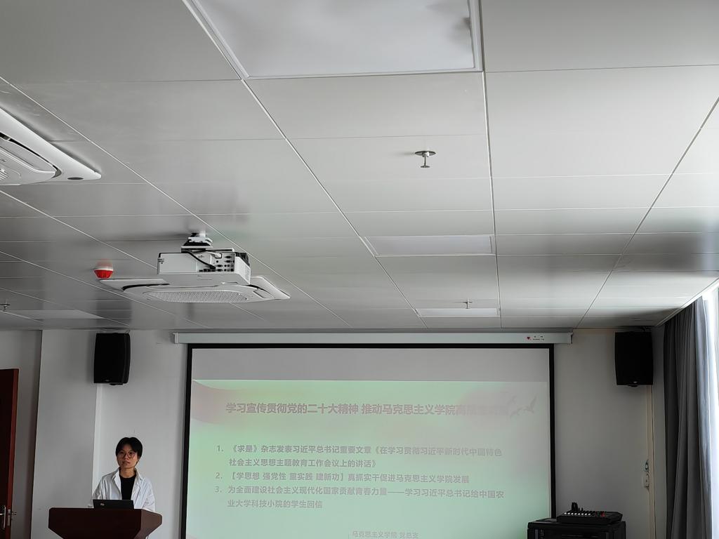 与会教师共同学习了习近平总书记在《求是》杂志上发表的重要文章《在学习贯彻习近平新时代中国特色社会主义思想主题教育工作会议上的讲话》,并围绕习近平总书记给中国农业大学科技小院学生回信内容,就如何发挥马院引领力在农业院校培养“懂农业、爱农村、爱农民、有理想、有本领、有担当”的农业农村现代化建设接班人问题上展开讨论。郑盼杰领学了习近平总书记给中国农业大学科技小院的同学们回信全文,并指出作为新时代的涉农高校青年思政课教师,要牢记习近平总书记嘱托,充分发挥“吃苦”和“奉献”精神,立足岗位,立德树人,同时要积极引导大学生志存高远、脚踏实地。徐鑫容指出总书记的回信,为学院形成高水平人才培养体系提供了价值引领和根本遵循。身处农林学院马克思主义学院,我们的人才培养要结合乡村振兴战略重大需求,培养出“懂农业、爱农村、爱农民、有理想、有本领、有担当”的农业农村现代化建设接班人,为乡村振兴提供人才支撑。