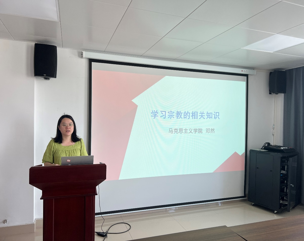 邓然围绕“学习宗教相关知识”做宗教政策宣传讲座,她从“学习宗教相关知识、党的二十大报告中关于宗教的论述、高校防范宗教渗透的对策”三个方面进行专题宣讲。