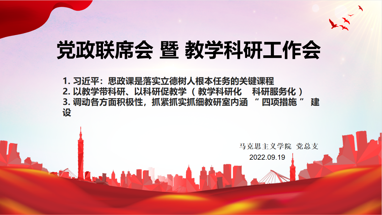 2022年9月19日,马克思主义学院党政联席会在学术交流中心五楼党员活动室召开。马克思主义学院党总支书记、院长邱兴平主持会议,马克思主义学院党总支副书记、副院长、分工会主席王晓明,马克思主义学院副院长周俊参加会议。