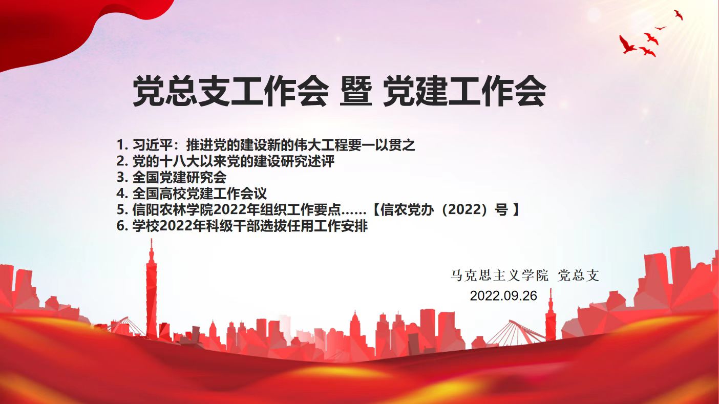 会议上各位老师关于党建工作做出发言,王晓明认为党的建设要做好基层党总支工作和党员的自身建设;周俊认为党的建设不仅要做到思想上,还要落实到行动上;吴昊认为一定要认真学习新的伟大工程的思想内核,将其落实到实处,切实落实到高校教学、科研、管理等工作中去,其他老师也就“新的伟大工程”发表了自己的看法。最后,邱兴平要求各党支部组织党员老师10月16日上午收看“中共二十大开幕”盛况,下午进行主题党日活动暨首届党建论坛,做好学习宣讲贯彻党的二十大精神工作。( 2022年9月21日上午学校2022年科级干部选拔工作会议结束后,立即传达学校科级干部选拔工作会议精神,要求大家认真学习有关文件,做好选拔推荐工作;2022年9月23日上午召开党总支委员会会议暨党政工联席会,决定由组织委员吴昊负责符合科级干部选拔条件老师自愿报名工作;2022年9月26日上午召开党总支委员会会议暨党政工联席会,讨论符合科级干部选拔条件老师报名情况,同意将符合科级干部选拔条件老师报名人选提交2022年9月27日下午全体老师会议进行民主测评 ,同时做好向学校有关领导、部门的汇报工作,争取理解与支持)。(马克思主义学院 熊峥)