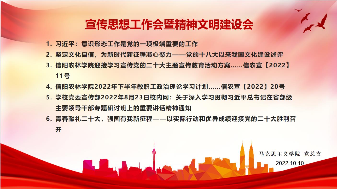 2022年10月10日,马克思主义学院宣传思想工作会暨精神文明建设会在学术交流中心五楼党员活动室召开。马克思主义学院党总支书记、院长邱兴平主持会议,党总支副书记王晓明、党总支宣传委员吴昊及各支部宣传委员周萃文、易明、蔡春丽参加会议。