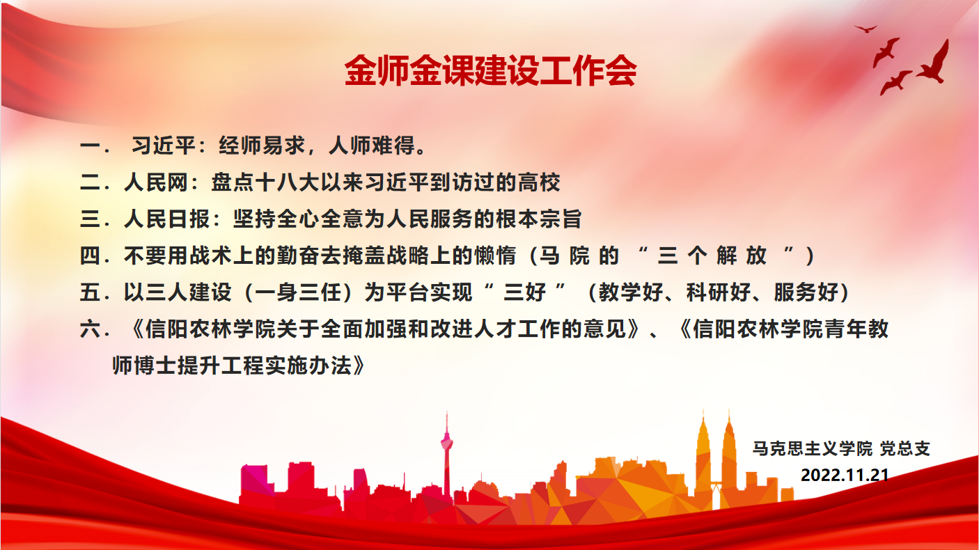 2022年11月21日,马克思主义学院金师金课建设工作会在学院党员活动中心召开。马克思主义学院党总支书记、院长邱兴平主持会议,各位思政课教师代表参加会议。