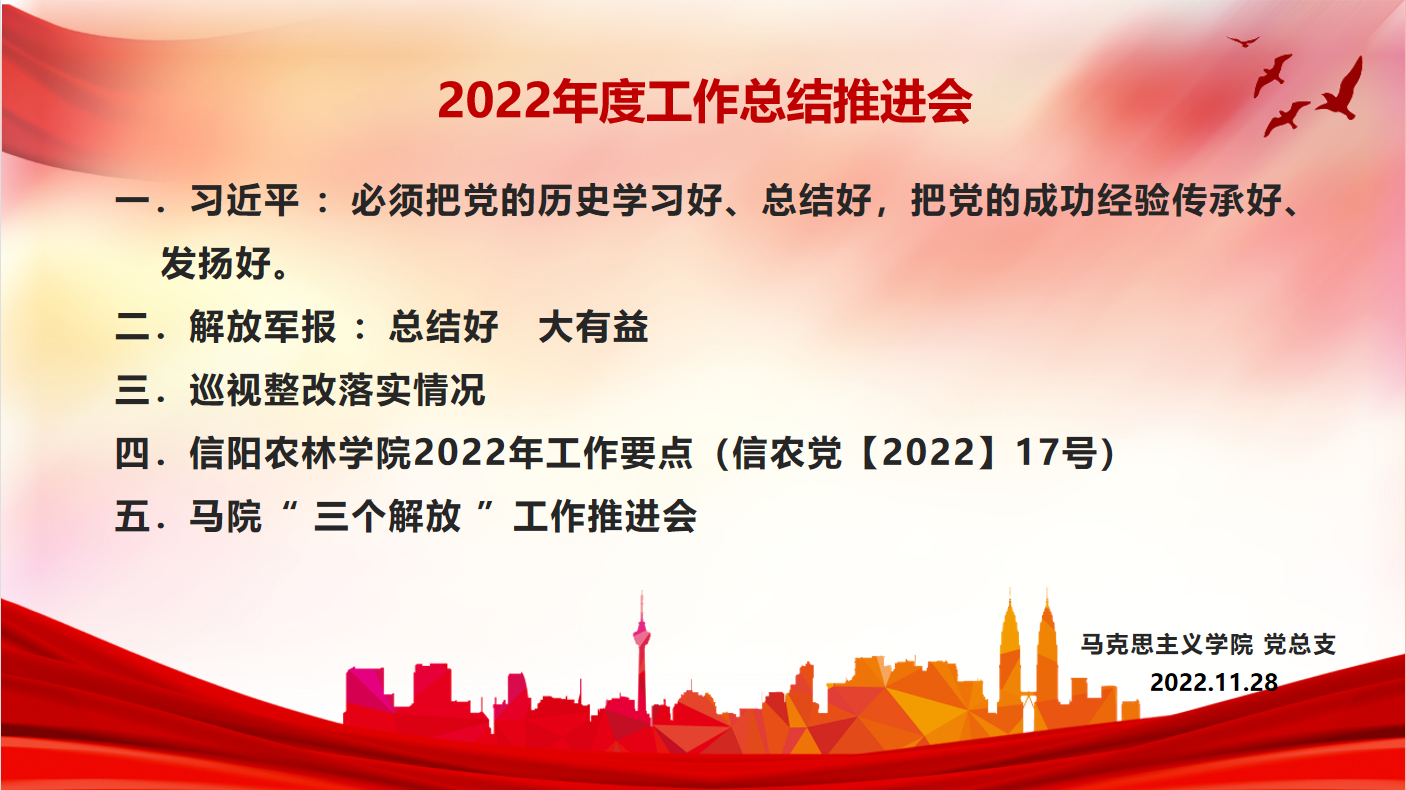 2022年11月28日,马克思主义学院2022年度工作总结推进会在学院党员活动中心召开。马克思主义学院党总支书记、院长邱兴平主持会议,马院党总支副书记、副院长王晓明、马院副院长周俊、各位教研室主任参加会议。