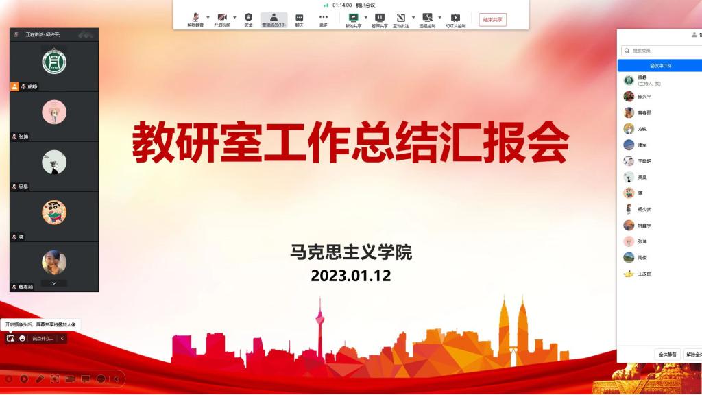 2022年1月12日,马克思主义学院教研室工作总结汇报会在线上召开。马克思主义学院党总支书记、院长邱兴平主持会议,马院党总支副书记、副院长王晓明、马院副院长周俊、各位教研室主任参加会议。