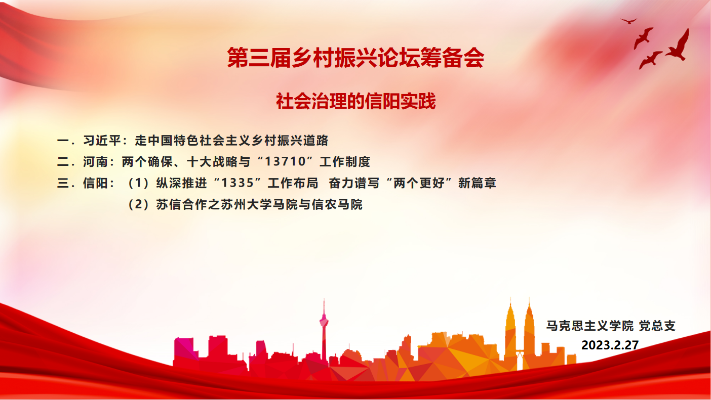 2023年2月27日,马克思主义学院第三届乡村振兴论坛筹备会在党员之家召开。马克思主义学院党总支书记、院长邱兴平主持会议,马院党总支副书记、副院长王晓明、马院副院长周俊、各位教研室主任参加会议。