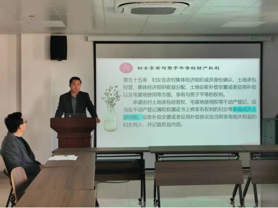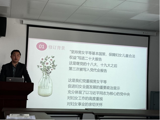 马克思主义学院教师黄志成以“《妇女权益保障法》在新时代发挥的新作用”为题开展宣讲。他首先详细阐述了党的二十大报告中关于坚持全面依法治国、推进法治中国建设特别是关于“坚持男女平等基本国策,保障妇女儿童合法权益”的重大部署,并从专业的角度解读了新修订的《妇女权益保障法》的修订背景。随后从六个方面详细介绍了该法修订的重点内容。
