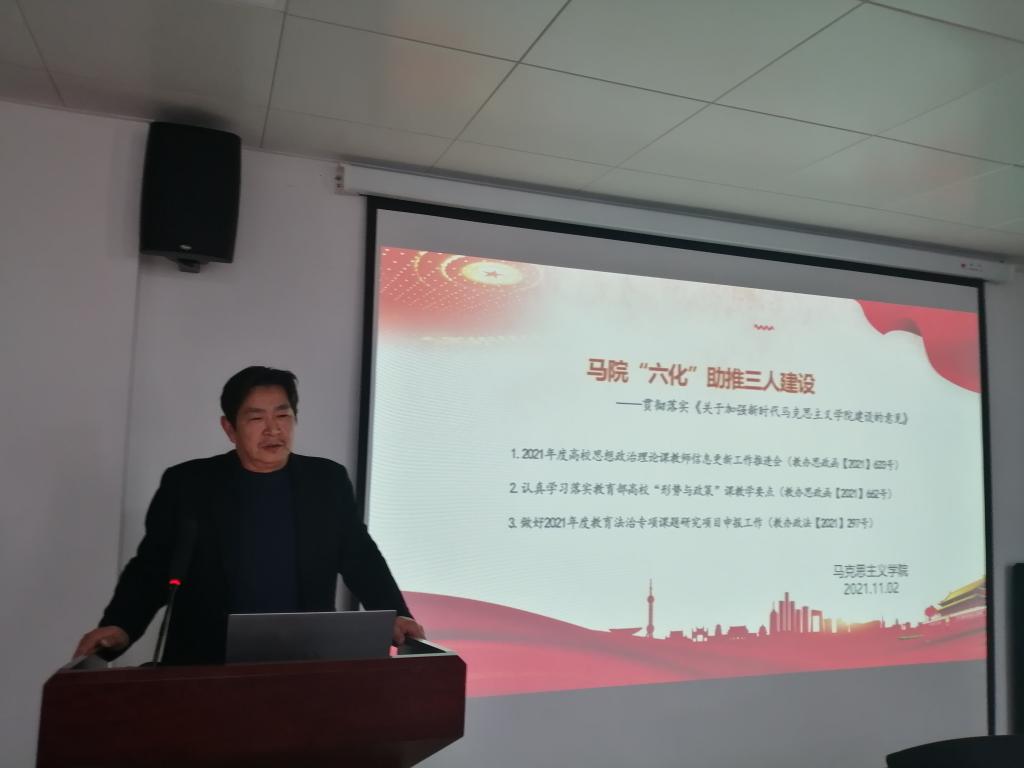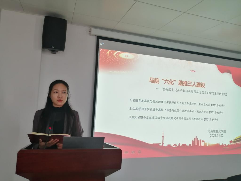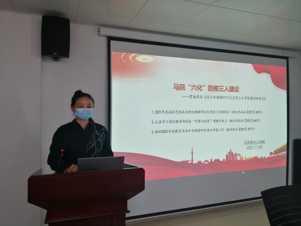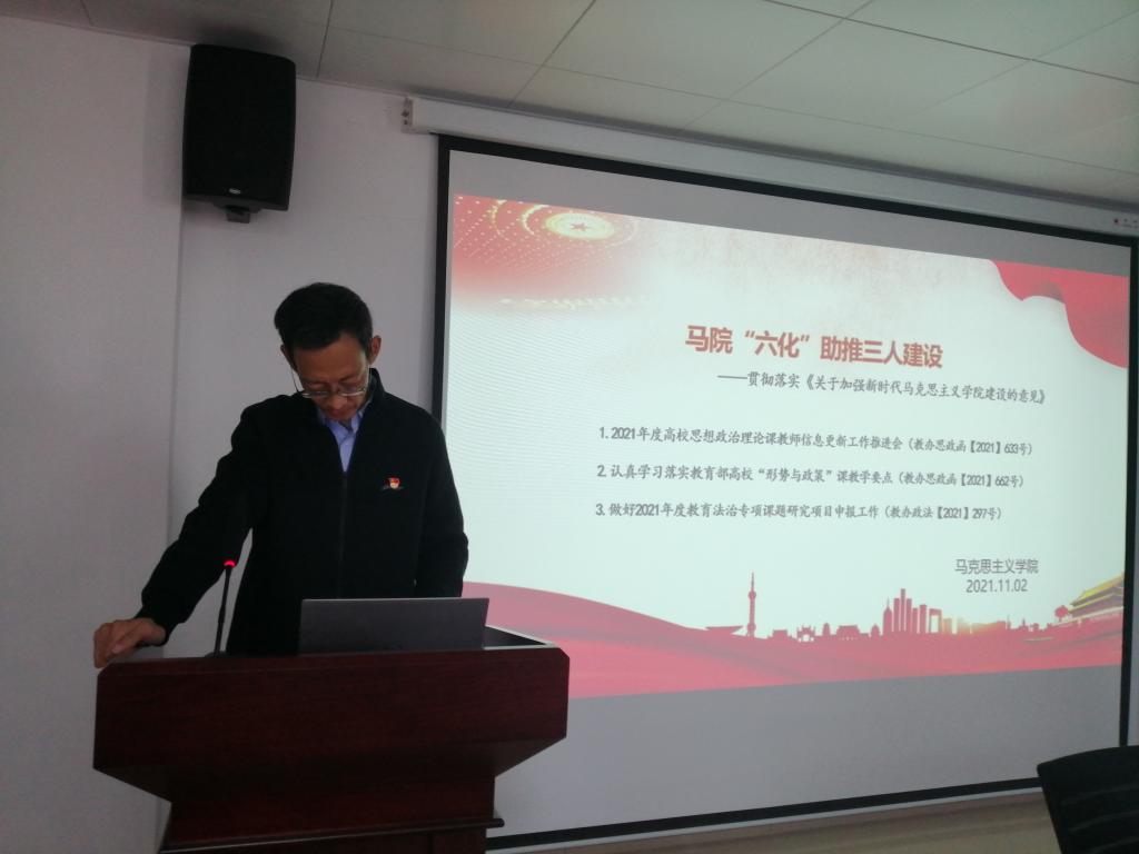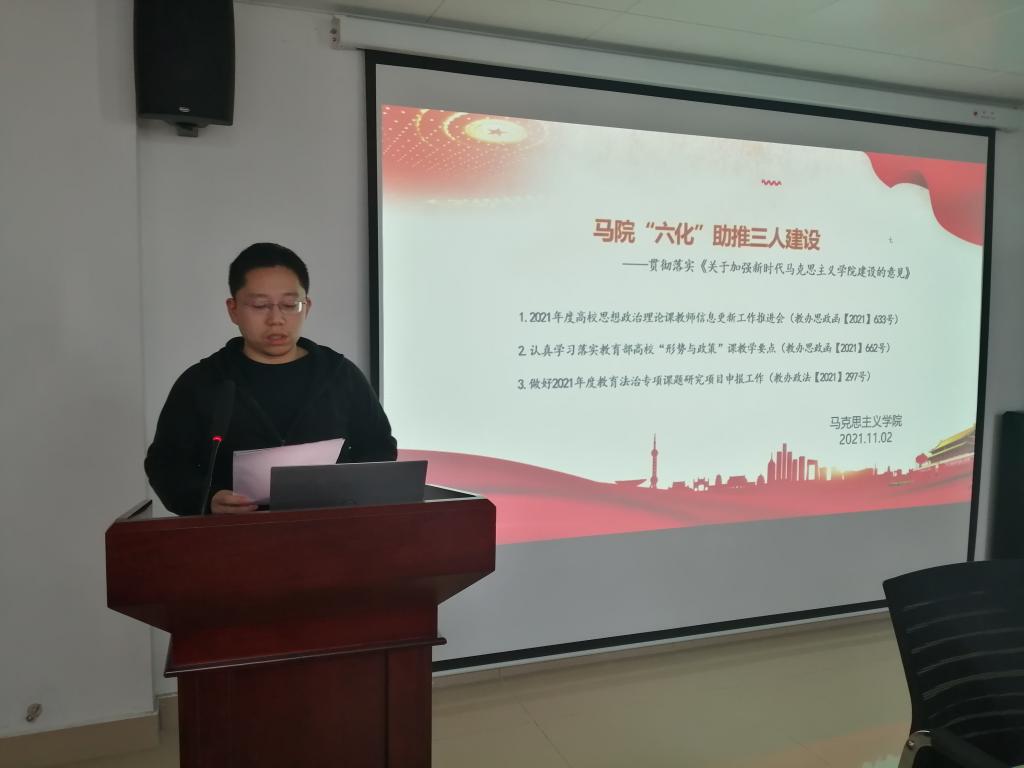 2021年11月2日下午,马克思主义学院在学术交流中心509开展了以“马院“六化”助推三人建设----贯彻落实《关于加强新时代马克思主义学院建设的意见》”为主题的“高质量发展”活动。会议由副院长周俊主持,学院全体教师参加。张曙光、李晓娟、马腾骧、方锐四位教师作主题发言。