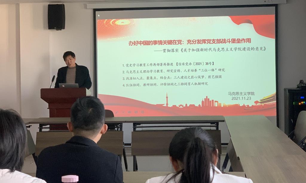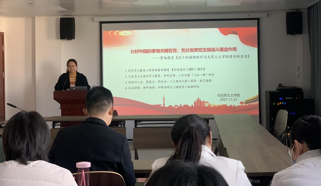 2021年11月23日下午,马克思主义学院在学术交流中心509会议室开展了以“办好中国的事情关键在党:充分发挥党支部战斗堡垒作用”为主题的“高质量发展”活动。会议由院长邱兴平主持,学院全体教师参加。
