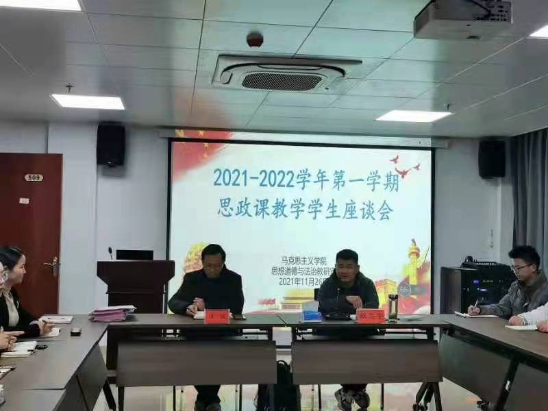 为充分了解思政课教师教学过程中的实际情况,加强教学信息反馈,切实提升思政课教学质量,马克思主义学院思想道德与法治教研室于2021年11月26日,在学院509会议室召开2021-2022学年第一学期思政课教学学生座谈会。马克思主义学院副院长周俊、部分教师代表及2021级学生代表参加,座谈会由思想道德与法治教研室主任姚鑫宇主持。