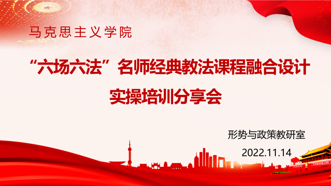 为提高教研室教师教法与课程融合设计实操应用能力,帮助全体教师更新教学观念、提升教学水平。11月14日下午,形势与政策教研室在学术交流中心513智慧教室召开“六场六法”名师经典教法课程融合设计实操培训分享会暨2022秋冬学期第六次集体备课会,全体专兼职教师参加,会议由教研室主任吴昊主持。