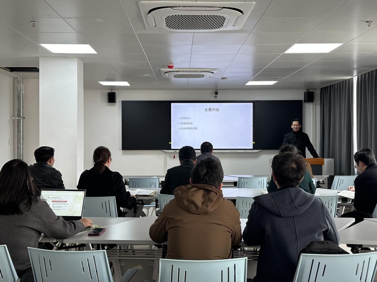 备课会上,张曙光老师从课程导入、国情把握、革命胜利的原因三个方面,向与会教师细致解读了第二章教学思路,马腾骧老师围绕第三章教学重难点、教学案例等进行了讲解说明。