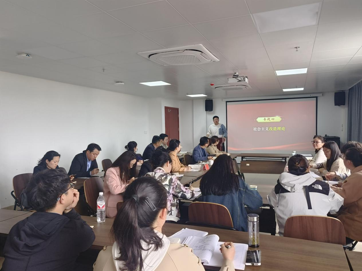 在集体备课环节,我院教师潘军、信阳学院教师骆文豪分别围绕《第六章 邓小平理论》《第三章 社会主义改造理论》从学情分析、教学导入、教学重难点、教学案例、教学方法等进行了精彩的教学展示,与会老师对两位授课老师的教学展示进行点评。