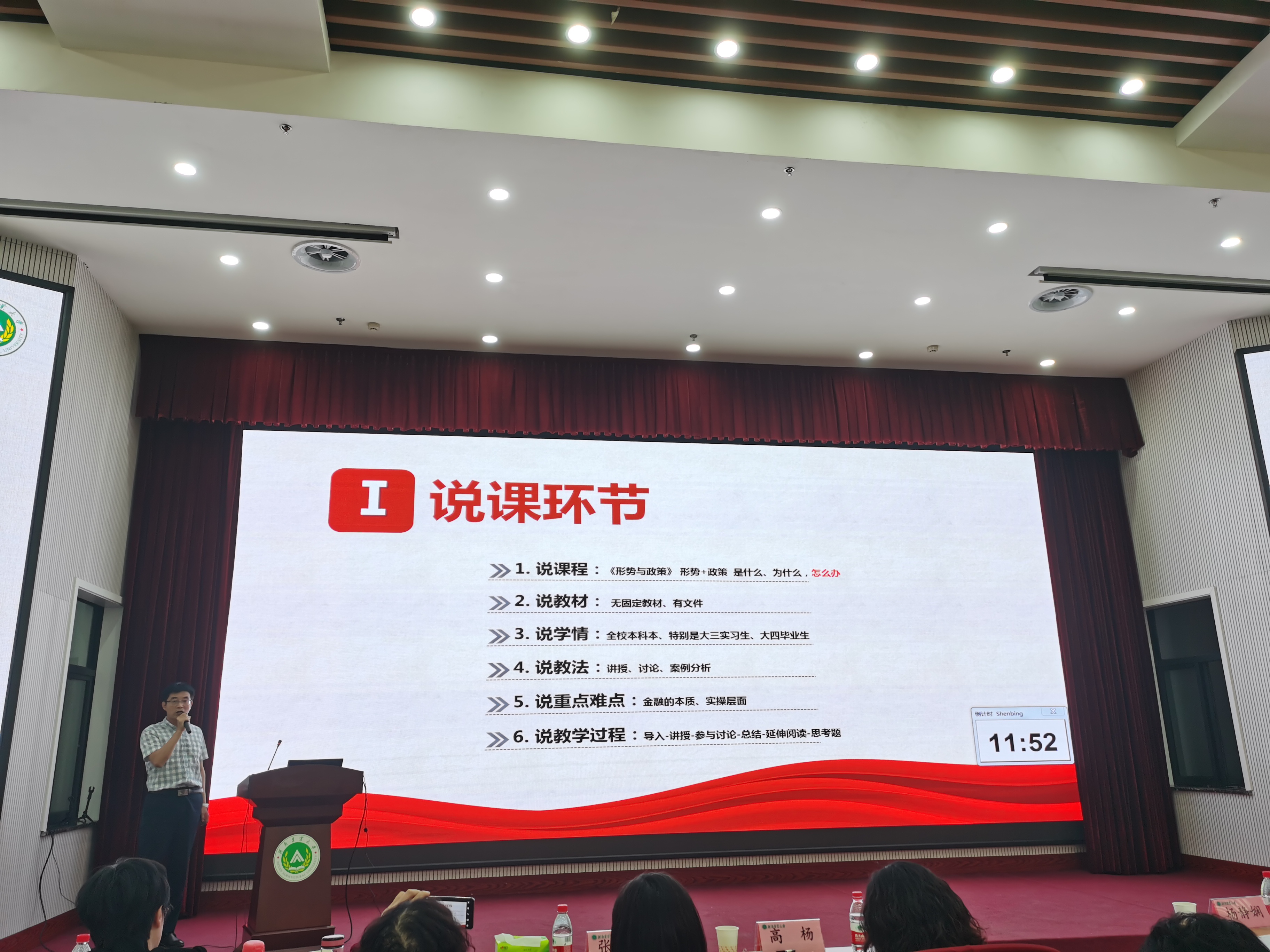 此次比赛由参赛选手围绕教材、自拟题目,进行3分钟说课和10分钟讲课;评分实行百分制,采取评委现场打分和其他师生使用学习通网上打分相结合的方式。五位评委和兄弟院校教师代表依次对参赛教师的教学展示进行了精彩点评,在肯定参赛选手内容准备充分、课件制作精美、精神状态饱满、教学风格多样,较好地展现了河南农大马院青年教师的风采和教学水平的同时,提出了中肯的意见建议,如选题宜小不宜大、论证观点忌片面、突出思政味等。评委们结合自己的成长经历,勉励青年教师珍惜大好时光,不负青春韶华,努力开创思政课教学新局面。特别是刘金鸽教授根据自己的教学经历、家庭经历和宣讲经历,强调思政课教师要对学生充满“热爱”、对工作充满 “热情”、对生活充满“感情”、对自己身为思政课教师充满“自豪”,引发了广大师生的阵阵掌声和无限共鸣。