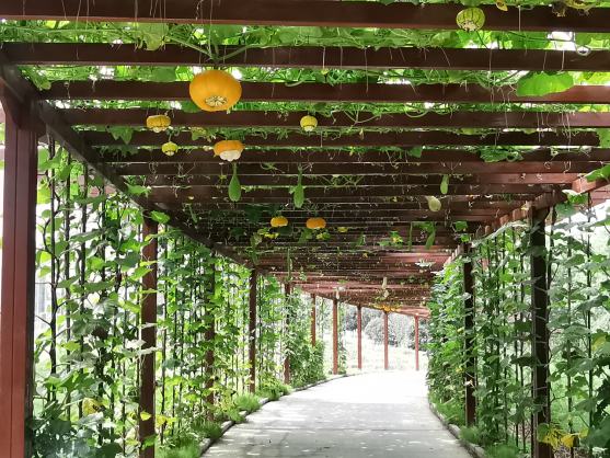 在建筑学上廊作为室内外的过渡空间,是构成建筑物造型上虚实变化和韵律感的重要手段,对空间的格局、体量的美化起重要作用,并能造成庄重、活泼、开敞、深沉、闭塞、连通等不同效果。园林中的游廊则主要起着划分景区、造成多种多样的空间变化、增加景深、引导最佳观赏路线等作用。近年来随着一二三产业融合发展,休闲观光农业和创意农业等新兴业态兴旺,花果长廊遍地开花结果,为不仅为人们提供采摘,农事体验、休闲观光和科普教育,也大大提高了农业多功能性,成为农民增收致富梯。园艺学院校内实习基地南瓜长廊全长130米,宽3.5米,高3米,共有观赏南瓜丝瓜黄瓜近20个品种。每个品种科普标识牌由园艺学院学生设计制作。
