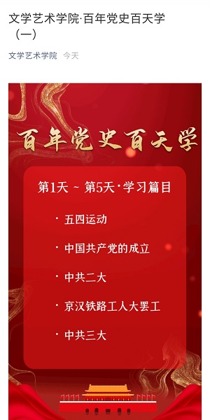 栏目内容将会在文学艺术学院官方微信公众号平台发布,每周一更新一期,推送一周(5天)的学习内容。带领全体师生在100天学习100个党的历史重大事件,回顾中国共产党艰苦卓绝、光辉荣耀的100年。全体师生通过个人自学、记录心得、分享交流等形式参与活动。