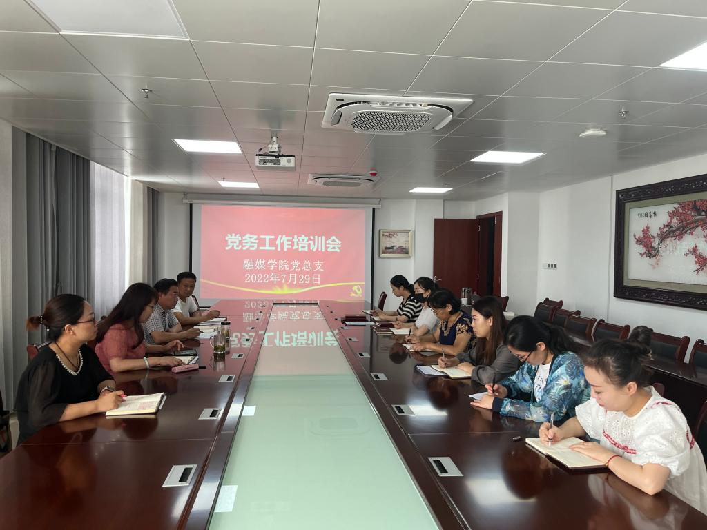 为进一步加强党支部建设,充分发挥党支部在学校建设与发展中的战斗堡垒作用,为进一步规范学院党建工作标准,提升各支部的党建工作水平,2022年7月29日上午,融媒学院党总支在学术交流中心415会议室召开了党务工作培训会。会议由院党总支书记关照霞主持,总支委员、各支部书记、支部委员和专职组织员参会。