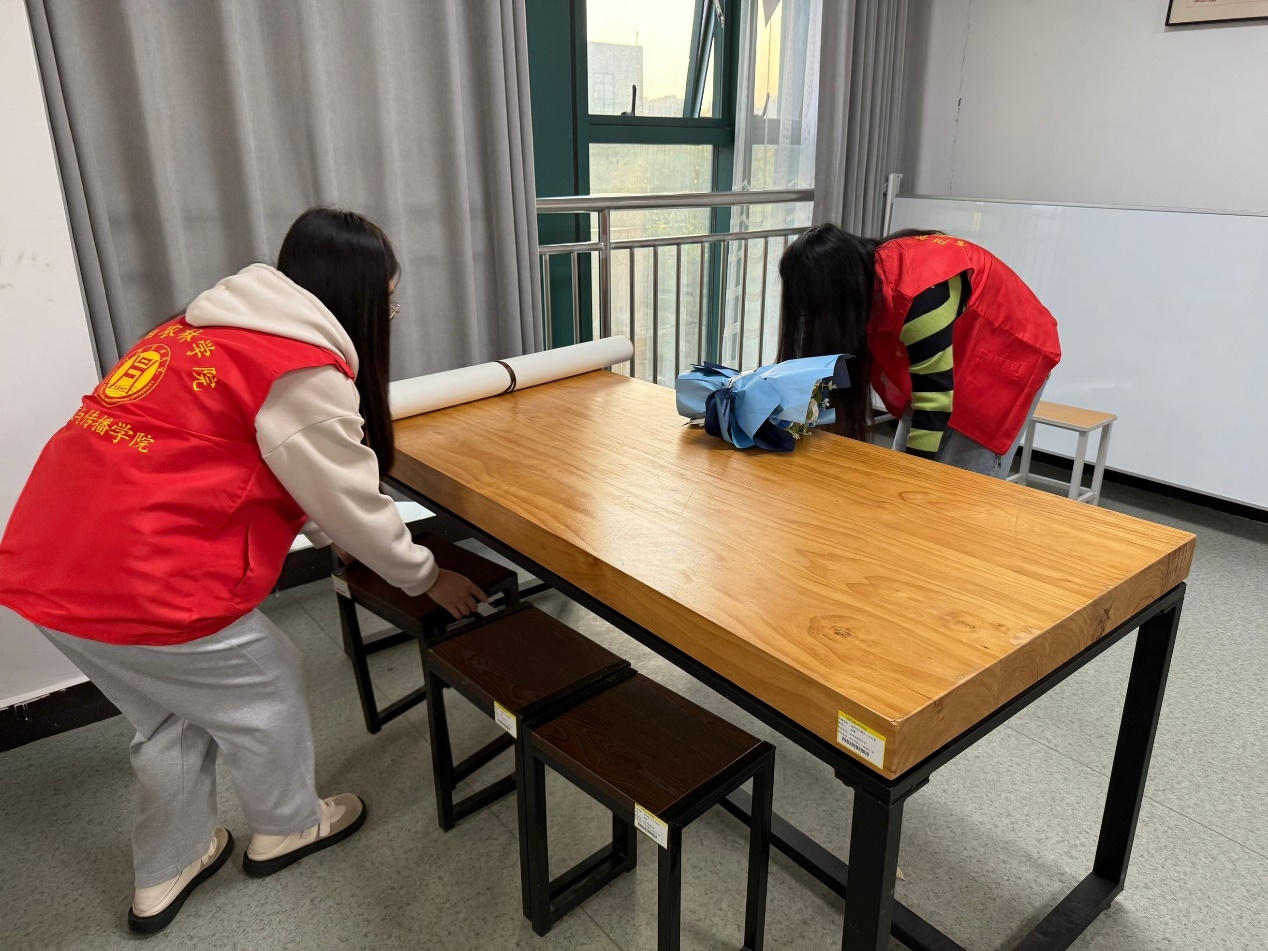 活动当天,党员志愿者们身着统一的志愿者服装,手持扫帚、拖把等清洁工具,准时来到美育实验室集合。在学院相关负责人的带领下,志愿者们迅速分组,明确了各自的分工和区域。志愿者们对实验室内的桌椅、讲台、地板以及教学用具进行了细致的清洁和整理,有的负责整理教学用具,有的则负责清扫地面,确保实验室的每一个角落都焕然一新。在美育实验室清洁工作完成之后,志愿者则又投入到学院公共区域的打扫工作中,他们穿梭在走廊、楼梯、大厅等区域,捡拾垃圾、清扫地面、摆放杂物,用实际行动传递着文明和卫生的理念。