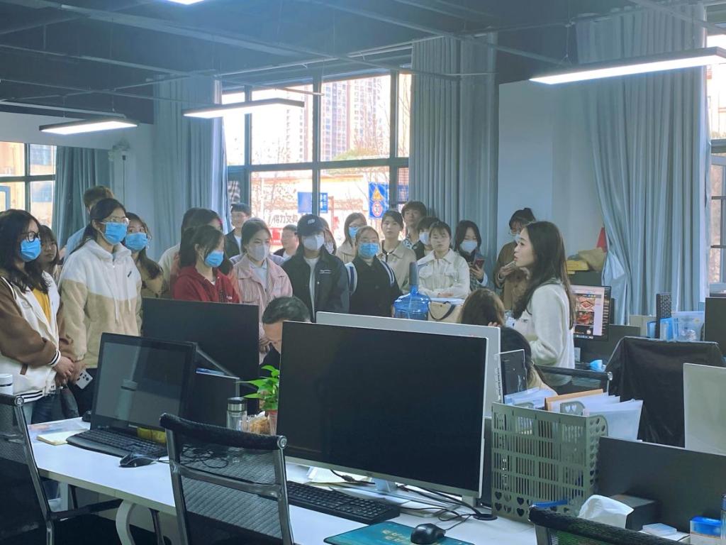 参观完信阳广电演播中心,同学们又来到了大信阳新媒体运营中心。为欢迎融媒学子的到来,该公司特地制作了标有“正青春 一起拼”字样的欢迎条幅,让同学们瞬间感受到了新媒体团队的青春和活力。运营中心负责人仲桑详细介绍了该中心的发展历程、人员构成情况、各新媒体岗位的主要职责和任务,带领大家参观了人才招聘工作室、新媒体工作室、电商直播间,并邀请同学们走进直播间,现场体验担任电商主播的真实感受。