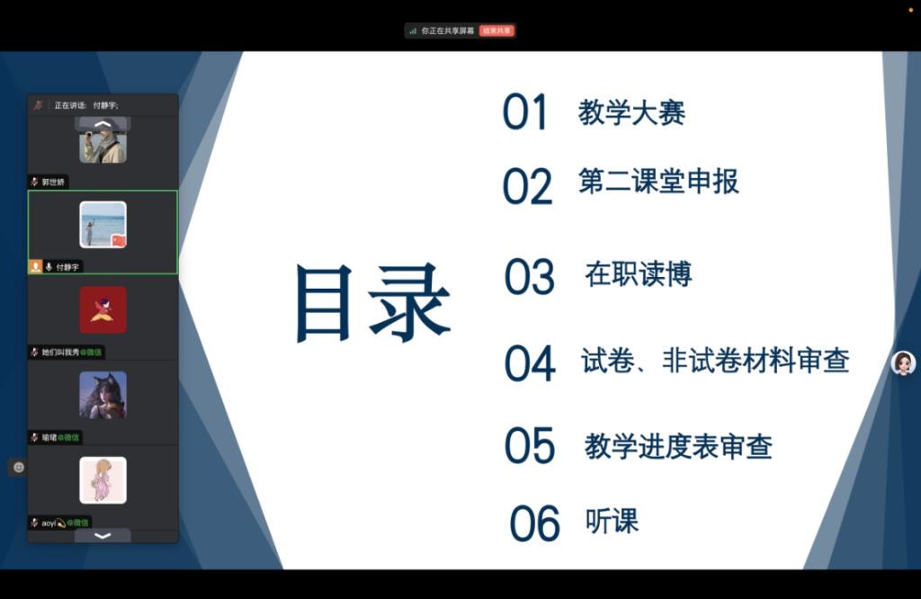 在教师个人发展与教学管理方面,会议明确三项重点任务:一是在职读博教师需严格按照学校要求,按时、规范报备,确保读博期间学习与教学工作协同推进;二是全体教师需高度重视试卷及非试卷材料审核工作,严格遵循教学资料审核标准,规范整理归档相关材料,确保材料齐全、流程合规,切实筑牢教学质量防线;三是全体教师需按时提交新学期教学进度表,明确各阶段教学目标、教学内容与实施计划,细化教学环节,保障新学期教学工作有序、高效开展。