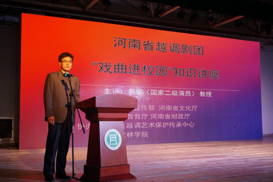 正式演出之前首先举行了简短的欢迎仪式,副校长赵一鹏致欢迎辞。他表示,“戏曲进校园”活动旨在弘扬社会主义核心价值观,传承中华优秀传统文化,切实增强学生的戏曲艺术素养和审美素养,是我们传承优秀传统文化、彰显传统文化魅力、提升文化自信的切实举措。戏曲文化是中华传统文化的瑰宝,对提高学生文化审美素养、塑造健全人格、拓展知识层面、培养高尚情操有着不可替代的作用。