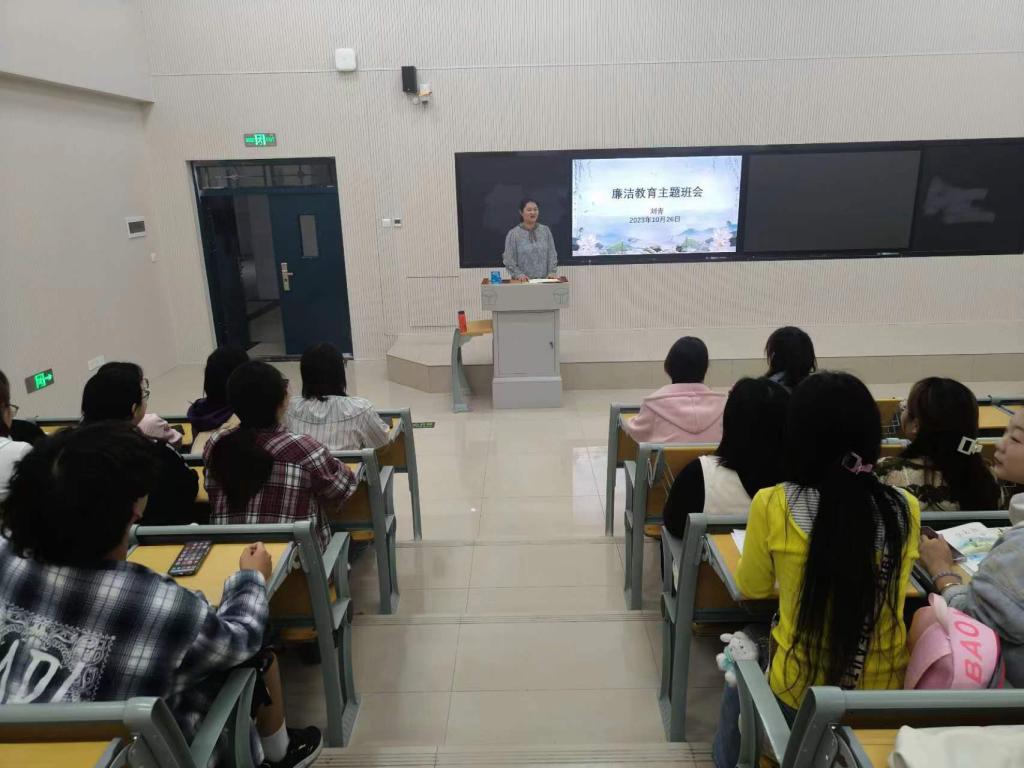 辅导员郜若霖列举焦裕禄、孔繁森等同志的廉洁故事,充分挖掘和感受清廉人物与清廉血脉,培育敬廉崇洁的意识,引导学生养成以廉为荣、以贪为耻的人生观,教育学生知敬畏、存底线。她寄语学生“莲思洁而尊,人因廉而正”,希望学生自觉主动将廉洁作风融入日常学习和生活之中。