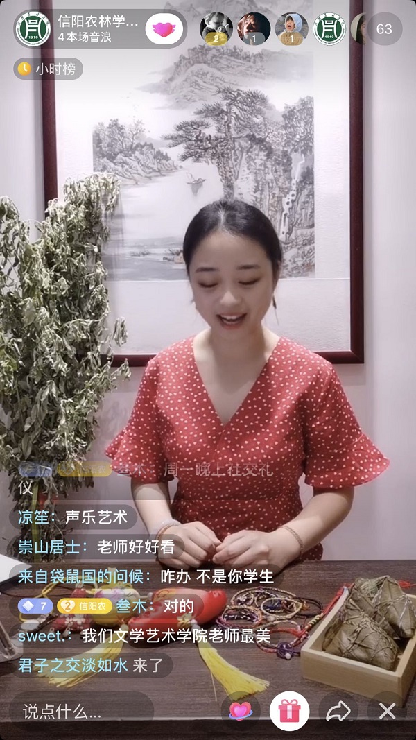 6月24日晚,在端午节即将到来之际,我院师生邀请全校同学相聚在“beat365在线平台官网报”抖音直播间,由我院赵展老师带领大家一起做香包、编彩绳,挖掘、分享端午节日蕴藏的文化记忆。直播过程中,赵老师不仅采用轻松愉快的方式教习直播间内的学生们掌握了做香包、编彩绳的传统技艺,同时还加入了演唱戏曲的直播环节,用昆曲清丽婉转的音调引导同学们关注我国优秀的传统文化,传承千年的端午习俗,为全校师生带来了一次别样生动的第二课堂。
