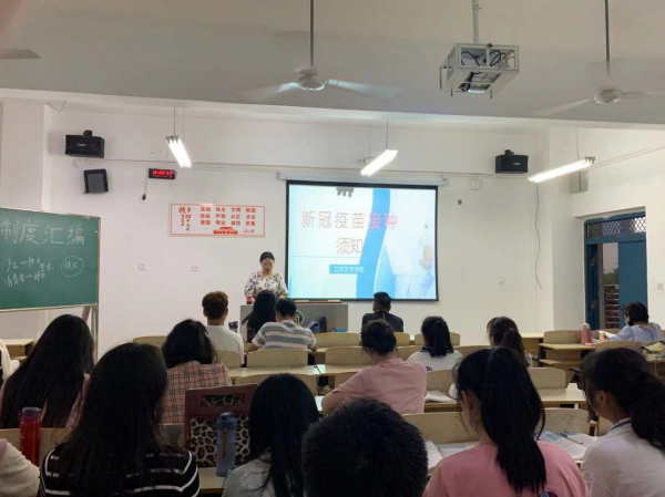 为进一步增强学生疫情防控安全意识,加深学生对新冠疫苗及其接种注意事项的认知,5月11日,文学艺术学院召开新冠疫苗接种须知及动员主题班会,班会由各班辅导员主持。