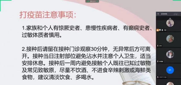 辅导员们深入分析了当前国内国际疫情防控的总体形势,普及疫苗接种相关知识,动员同学们响应国家号召,积极接种疫苗,共筑免疫长城;细致解读了疫苗的接种禁忌,强调一定要如实向接种医生报告个人身体状况,安全有序接种。之后,详细讲解了接种注意事项:一是接种前,及时了解新冠疫苗相关知识及流程,做好相关准备,携带有效证件;二是接种时,做好个人防护工作,如实告知个人健康状况和接种禁忌等信息,有序排队,配合现场工作人员,接种后留观30分钟;三是接种后,避免剧烈运动,保持接种部位干燥清洁,清淡饮食,若身体不适,及时就医。