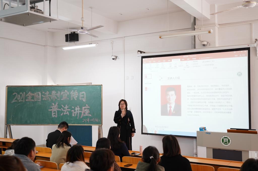 本次讲座由浉河区人民法院一级法官、董家河人民法庭庭长高海波主讲,高海波法官运用真实案例从学生寒暑假兼职如何防止被骗、网购个人信息泄露如何自我保护、情侣之间财产赠与性质如何划定三个方面进行讲述,将宪法知识与大学生生活实际紧密结合,极大激发了同学们知法、懂法、学法的热情。