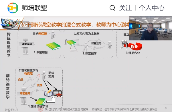 陕西师范大学博士生导师何聚厚从教学创新思维发展、教学重构创新设计以及教学创新设计实践这三个方面,分析了数字化转型背景下教师教学能力发展内涵;阐释了如何基于翻转课堂教学重构智能技术支撑的混合式教学以及如何基于国家智慧教育公共服务平台设计实践混合式教学。