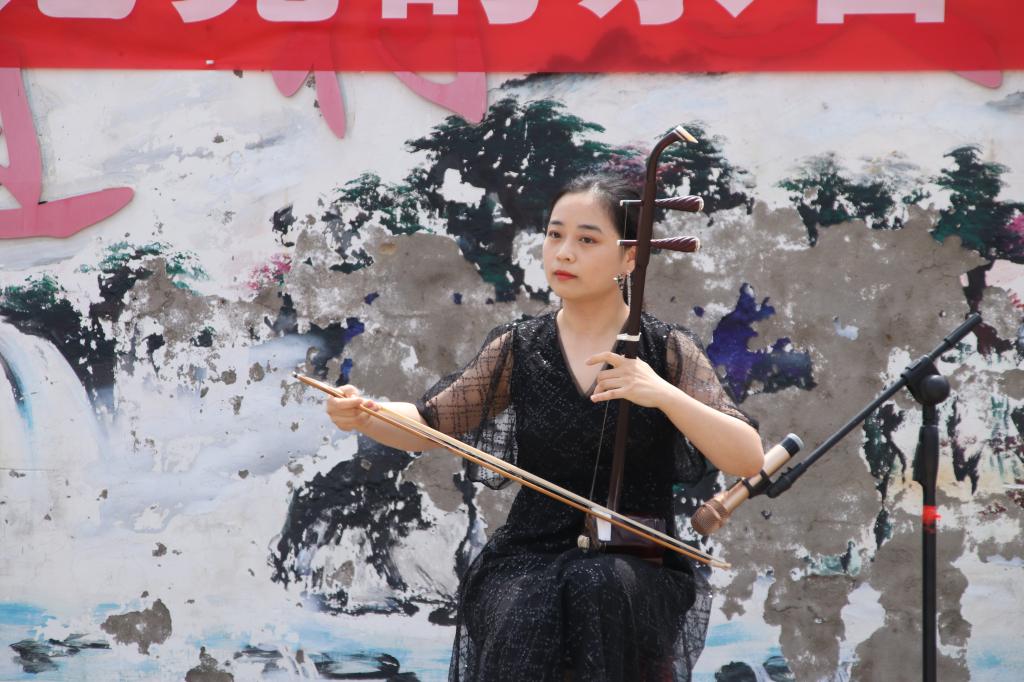 随后,副校长黄立一行与乐道村党员、群众共同观看了文艺演出。演出在一首男生独唱《中国人》的动人旋律中拉开帷幕,虽然当天正值高温,但参演师生激情饱满,将一个个精心准备的节目完美地呈现在舞台上。戏曲选段《女驸马》、合唱歌曲《为了谁》、现代舞蹈《激情派对》等精彩节目轮番上演,让观众陶醉其中,不时欢呼鼓掌。来自固始县民间剧团的演员们带来了民间戏曲、花船舞表演,极具地方特色的表演风格,散发着传承千年的民间艺术魅力。青年教师赵展表演的二胡独奏《赛马》将节目推上高潮,一曲《孤勇者》吸引了台下的小观众们跟随节奏大声合唱,乐道冲村的文化广场变成了欢乐的海洋。最后,演出在师生大合唱《没有共产党就没有新中国》的豪迈歌声中圆满落下帷幕。