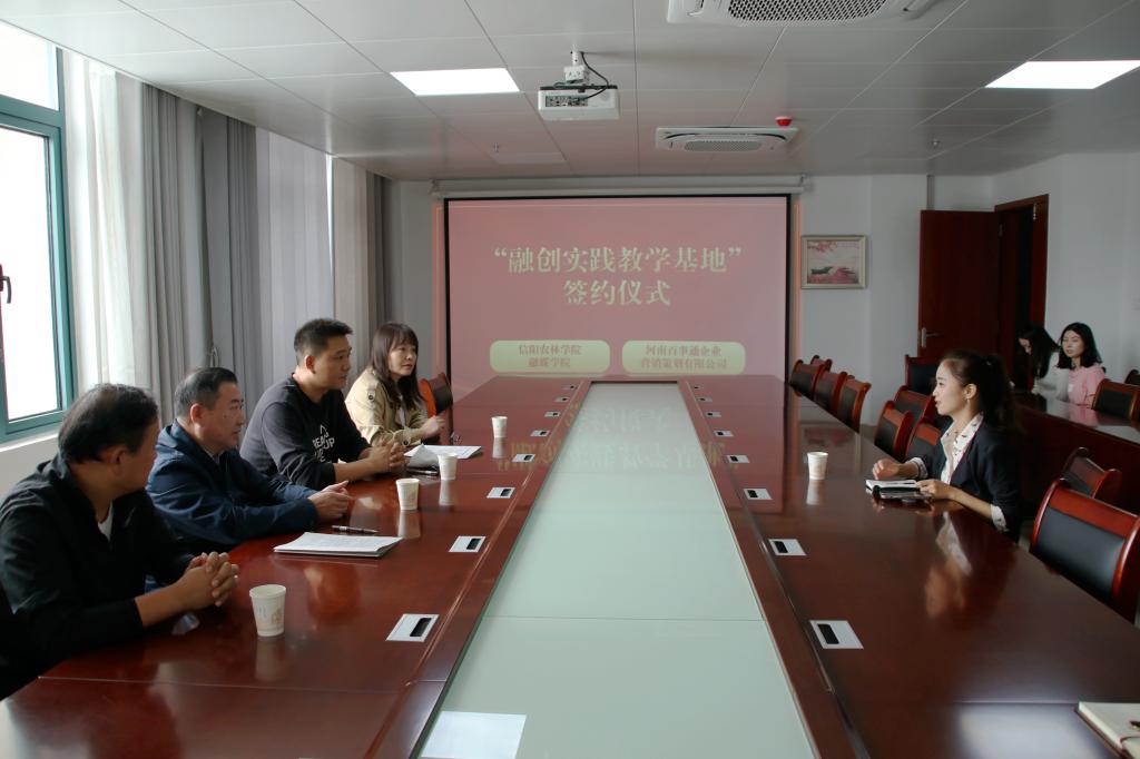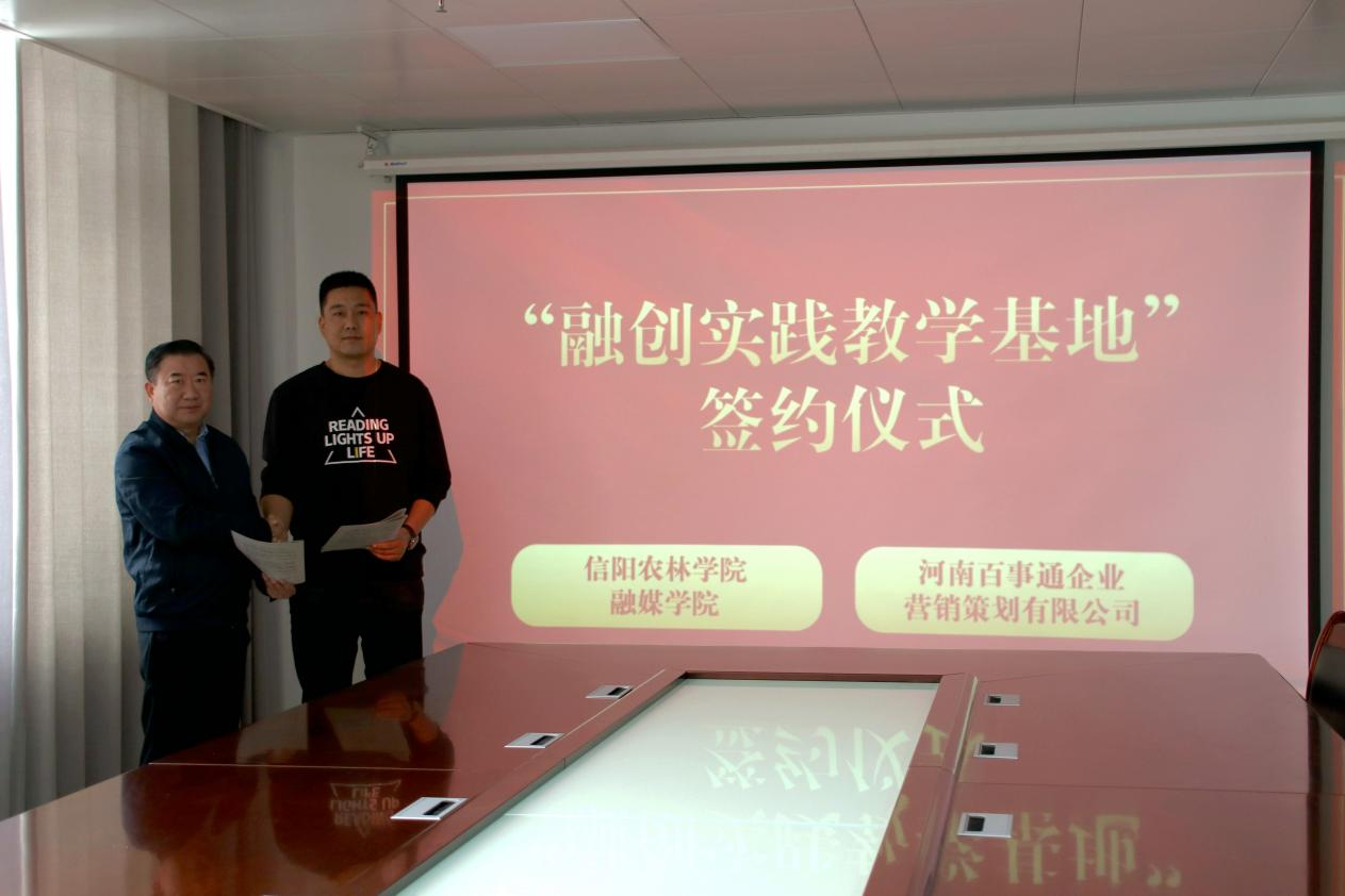 9月27日上午,融媒学院与河南百事通企业营销策划有限公司共建“融创实践教学基地”签约仪式在学术交流中心415会议室举行。融媒学院党总支书记关照霞、院长黄炎军、副院长何鑫、河南百事通企业营销策划有限公司总经理彭浩、大信阳负责人仲桑出席了本次签约仪式。