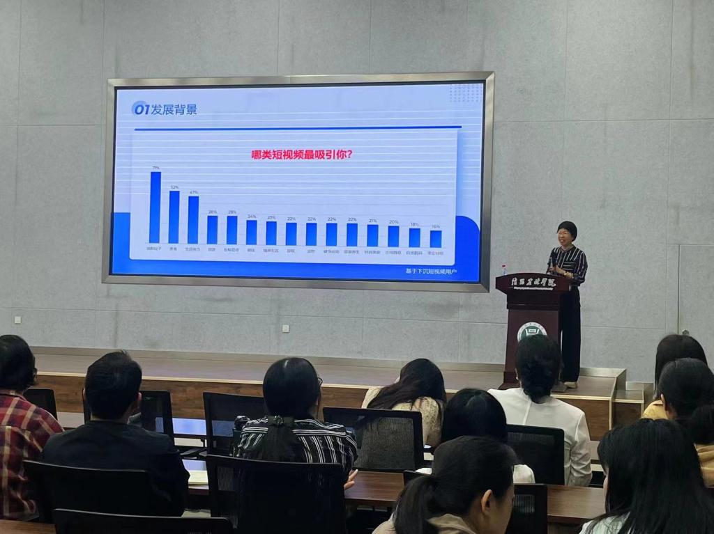 4月26日下午,人文与传播学院特邀河南广播电视台高级编辑王红在学术交流中心一楼报告厅作了一场题为“新媒体的发展态势及价值取向——以短视频为例”的学术报告。人文与传播学院院长张立恒、副院长嵇丽娜、部分专任教师及网络与新媒体专业学生聆听了本次报告。报告由人文与传播学院付静宇老师主持。
