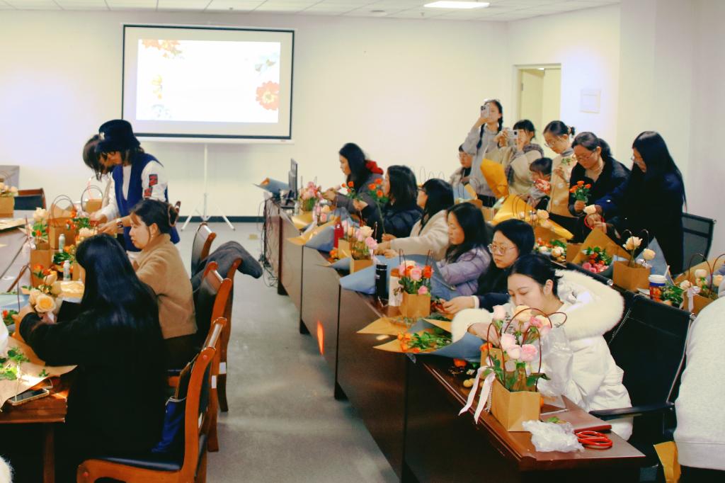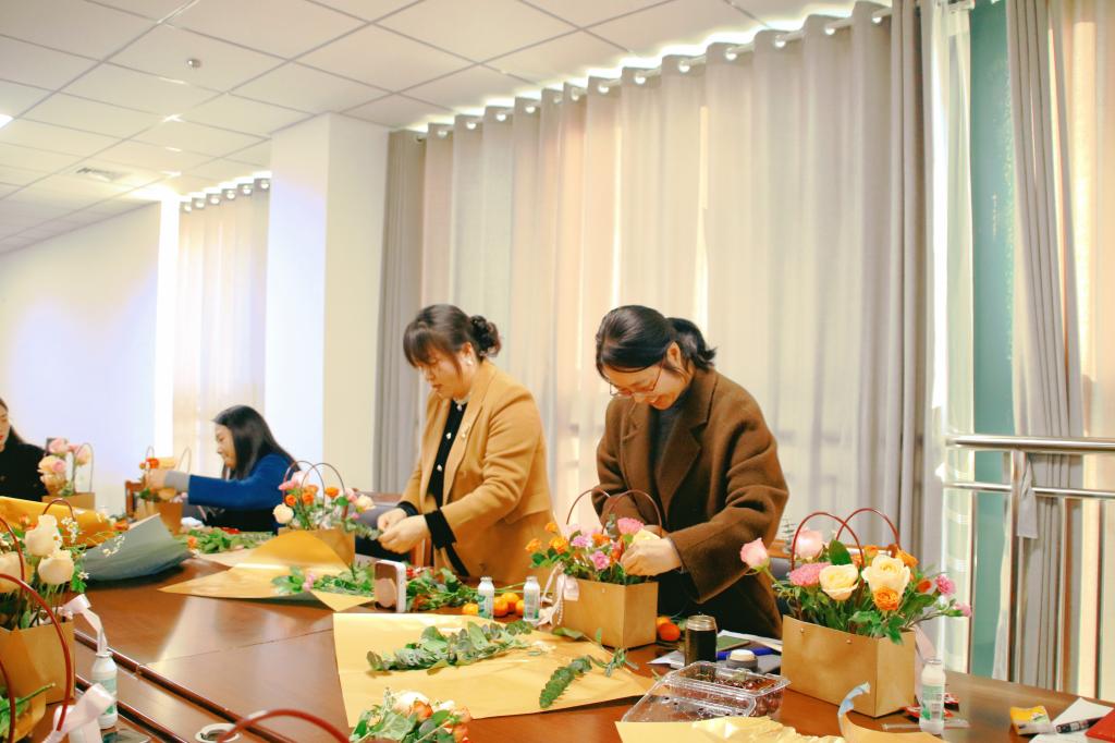 分工会邀请专业花艺师,为教师们讲解花卉百科、中外花艺美学,了解花朵的娇嫩与美丽,以及世界的多姿和精彩。在花艺师的指导下,教师们挑选花枝、精心修剪、巧思搭配、兴致盎然,让鲜花绽放在花篮,将美好寄托与新年。
