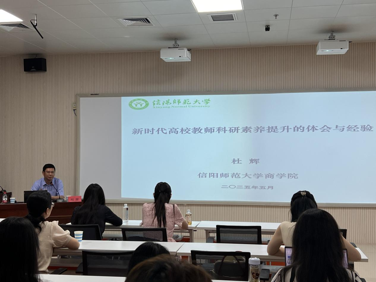 5月21日,教师发展中心联合人文与传播学院在多功能厅举办了2025年第八期“新时代高校教师科研素养提升的体会与经验”主题工作坊。本次活动特邀信阳师范大学商学院副院长杜辉教授担任主讲。