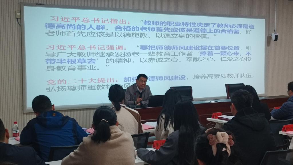 开班仪式后,赵聘以《弘扬教育家精神 争做新时代“大先生”》为题,为新入职教师作了开班第一讲。赵聘结合详实案例,强调了师德师风建设在师资队伍建设中的重要性,要求新入职教师把师德修养作为一生的“必修课”,把崇德尚教作为一生的功课;详细解读了《新时代高校教师职业行为十项准则》,他勉励大家要弘扬教育家精神,争做新时代“大先生”,为学校高质量发展作出自己的贡献。