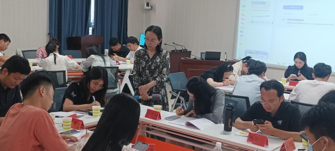 接着,邵颖进一步介绍了智慧树中的小组教学功能,通过平台自动选出了6名组长及其组员,展示了智慧树在提升教学互动性和团队协作效率方面的优势。随着活动的深入,还向新进教师们演示了智慧树平台的随机点名、抢答、手势签到等功能,并强调这些功能的运用不仅能够激发学生的学习兴趣,还能有效提升教师的教学效率和课堂管理能力。