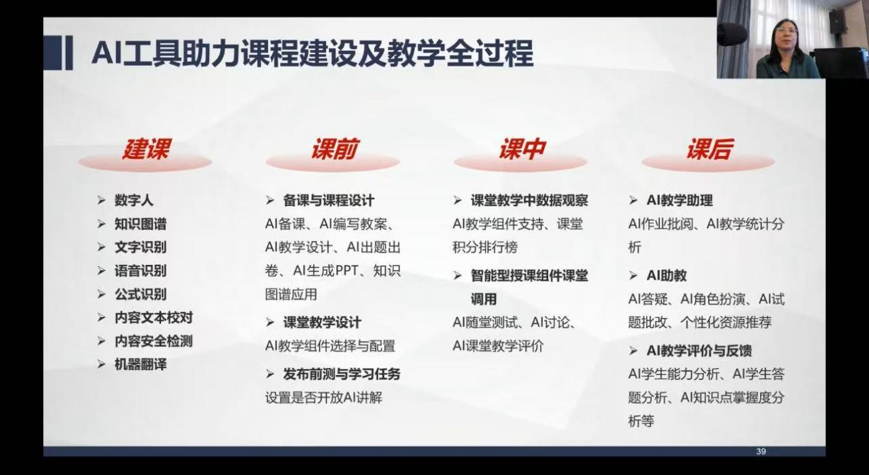 本次培训以“人工智能技术与教育教学深度融合”为主题,系统解析了DeepSeek大模型在智慧课程全流程建设中的创新应用。培训共分为三大模块,依次从应用场景实践、全流程建设到前沿技术探索层层递进,分别由西南财经大学张克雯教授、西北工业大学张莹教授、中北大学薛英娟教授担任主讲。