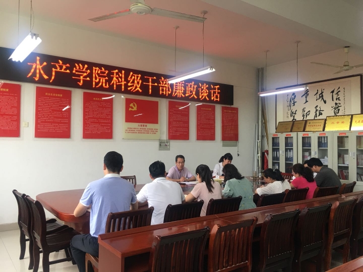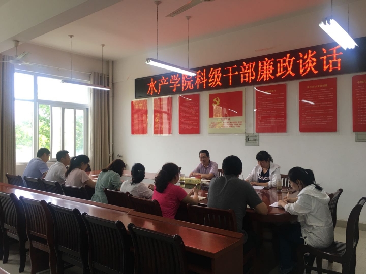 6月18日下午,水产学院在党员活动室召开新任职科级干部廉政谈话会。水产学院党总支书记郭旭升、副书记兼纪检委员兼青年委员黄光玲和8名新任职科级干部参加了集体廉政谈话。