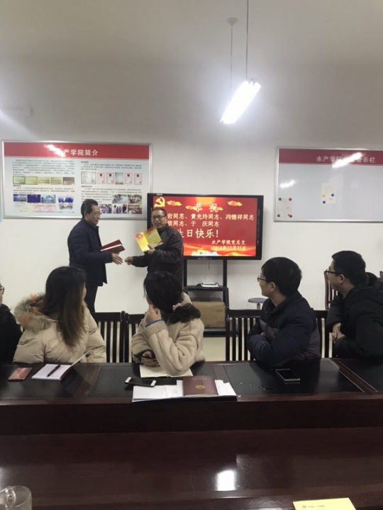 12月25日下午,水产学院党总支在学院党员活动室开展了以“牢记政治生日 践行党的宗旨”为主题的党员“政治生日”庆祝活动,为第三、四季度入党的5名师生党员集体过“政治生日”。全院在校师生党员参会。活动由水产学院党总支组织员黄光玲主持。