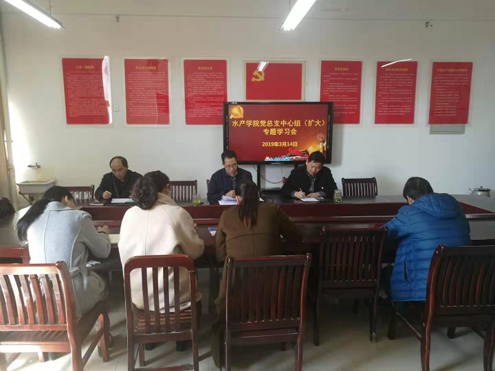 3月14日上午10点,水产学院党总支在党员活动室召开中心组(扩大)专题学习会。水产学院总支委员、各支部书记等相关同志参加了会议。会议由水产学院党总支书记郭旭升同志主持。