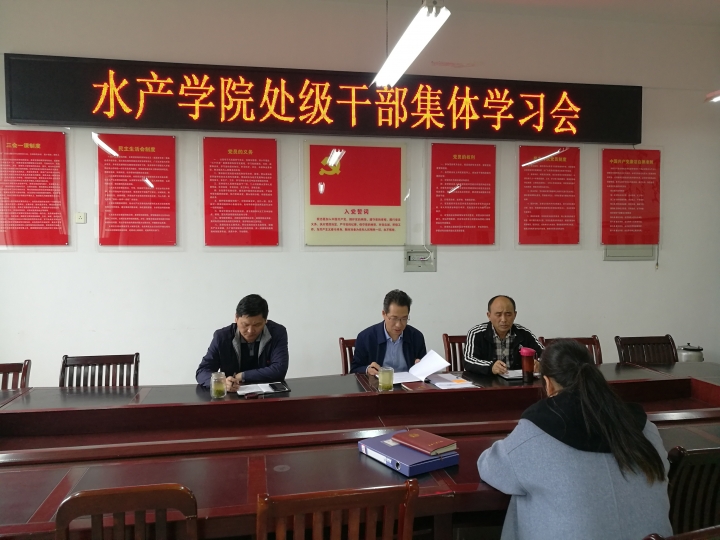 4月23日上午9点,水产学院在党员活动室召开处级干部集体学习会。水产学院中层副职以上干部参会。会议由水产学院党总支书记郭旭升主持。